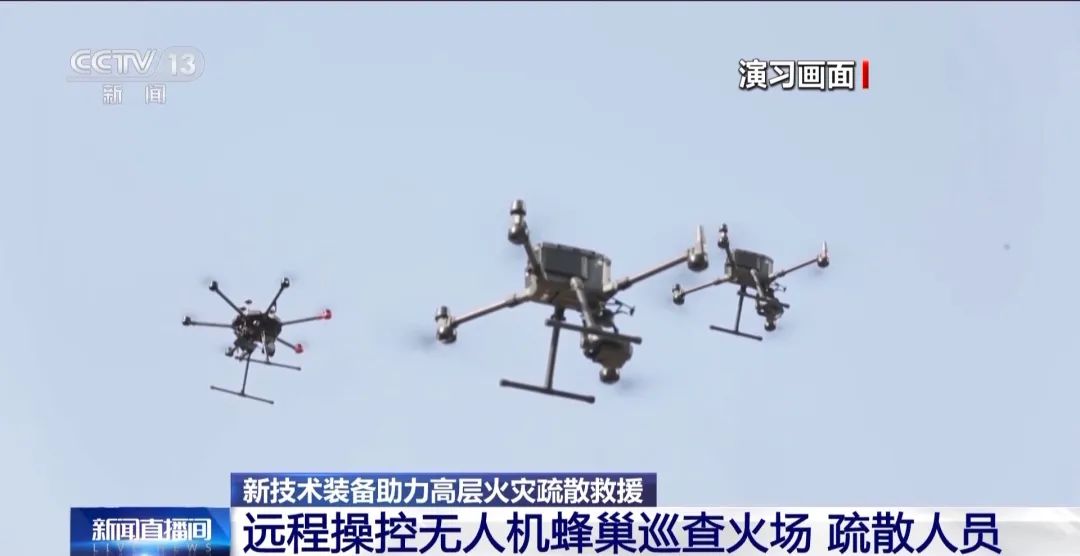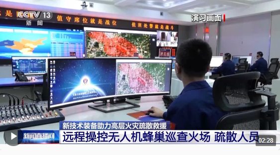 演习模拟太原一处34层高的商业综合体发生火灾,大量人员被困7层的疏散平台。接到报警后,指挥中心第一时间远程操控无人机蜂巢,多机编队迅速前往火灾地点进行巡查。了解现场火情和周边道路等实时信息,通过无人机广播指导火场人员正确逃生,疏散危险区群众。同时将现场视频信号实时传回指挥中心,迅速制定救援方案,实时指挥救援。
