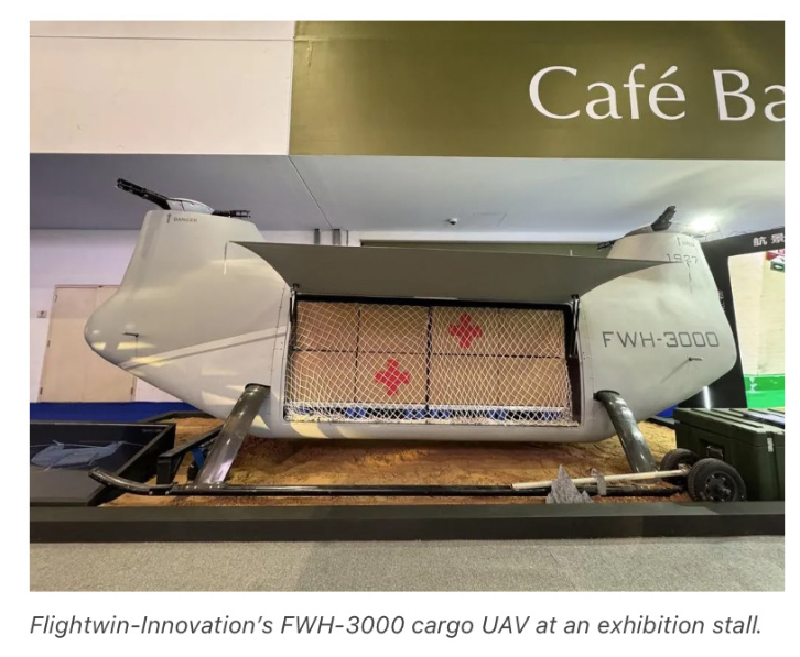“FWH-3000的外形很像美国'支奴干'直升机,并将被作为可空中飞行的多用途运输无人机引入全球市场。在航空航天和国防展览上,航景创新还展示了一架单旋翼物流无人直升机FWH-1500。”