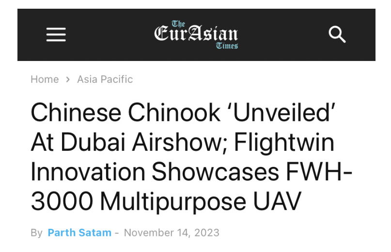 随着无人化的行业趋势加深,中东地区市场潜力巨大。航景创新自主研发的FWH-3000纵列式无人直升机,最大起飞总量达到2.5吨,有效载荷达到1吨,是当前行业内乃至全球载重最大的无人直升机,获得The EurAsian Times欧亚时报的全面深度报道。