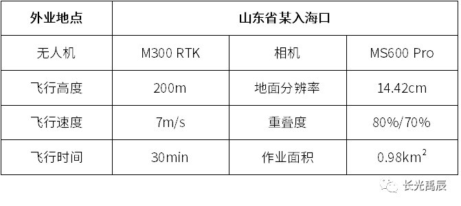 本案例选取山东省某入海闸口作为实验目标,使用M300 RTK无人机搭载长光禹辰自主研发的6通道多光谱相机MS600 Pro,获取了内流河、入海口岸线与海面复合场景的影像,具体外业情况见下表: