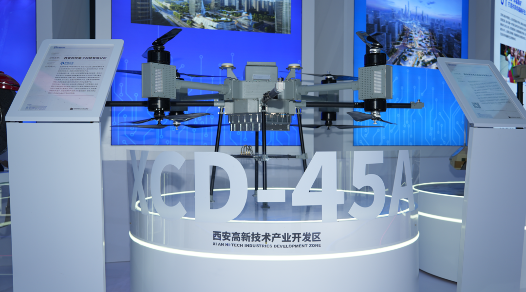 本次博览会,羚控科技展出的XCD-45A、FCD-20两款无人机均为行业应用型无人机。其中,XCD-45A是由羚控科技成都研发中心研制的一款系留无人机,起飞重量45kg,有效载荷10kg,连续滞空作业12h,升空高度210m,最大起降海拔超过4600m。可搭载通信电台、多功能吊舱、高速相机、应急照明灯等载荷,完成中继通信、光学监测、高空监测等任务。