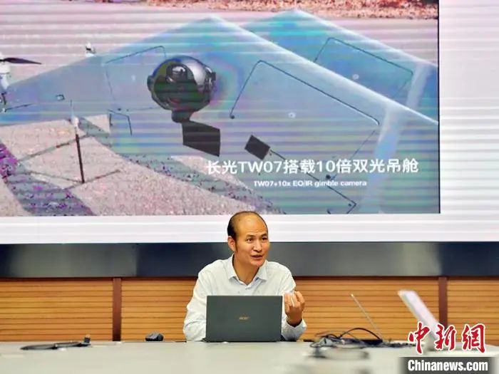 白越向记者介绍双飞翼垂直起降固定翼无人机情况
