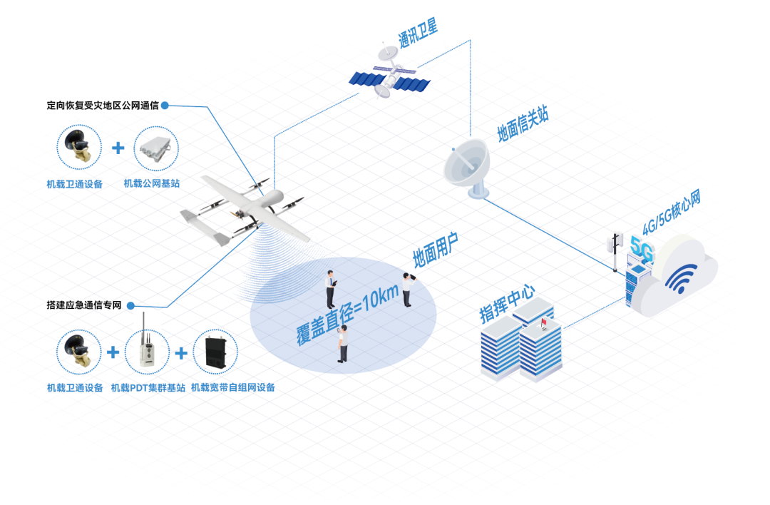 定向恢复受灾地区公网通信:HC-541应急通信复合翼无人机搭载机载卫通设备、机载公网基站,通过高空飞行与卫星保持链路通信,采用4G/5G通信技术,经由卫星传输将业务数据回传至运营商核心网,定向恢复受灾地区公网通信,为灾区用户提供语音、短信和上网服务。