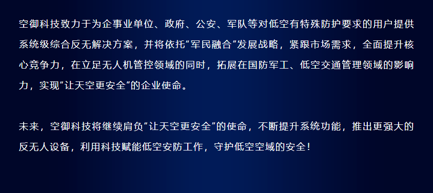 多年来,空御科技始终奋战在低空安防保障的第一线,不断优化产品和解决方案,凭借扎实的自主创新实力、贴近用户的解决方案和专业快捷的客户服务,赢得了市场的广泛认可。未来空御科技将继续积极推动行业健康有序发展,为国家反恐、维稳、民众安全及军事应用提供有力支撑,成为国家空域安全背后的中坚力量。