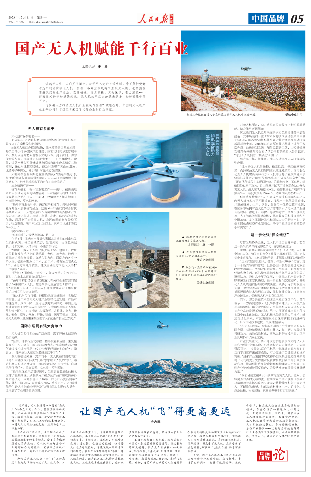 12月11日,人民日报海外版刊发专题文章《国产无人机赋能千行百业》《让国产无人机“飞”得更高更远》,介绍了为何要大力推动无人机产业发展与应用,以及放眼全球中国的无人机产业水平如何。现将全文分享如下。