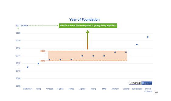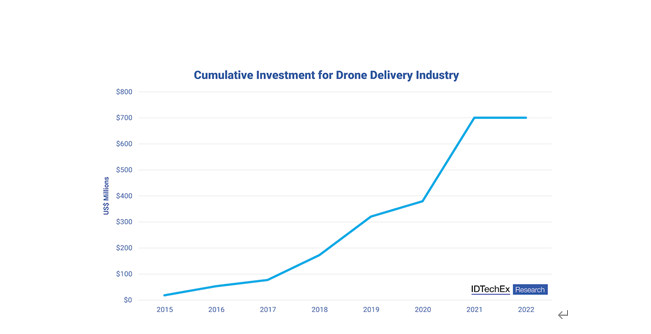 过去几年,IDTechEx在无人机配送行业的累计投资不断增长。然而,由于巨大的监管障碍,IDTechEx 注意到过去两到三年投资急剧放缓。