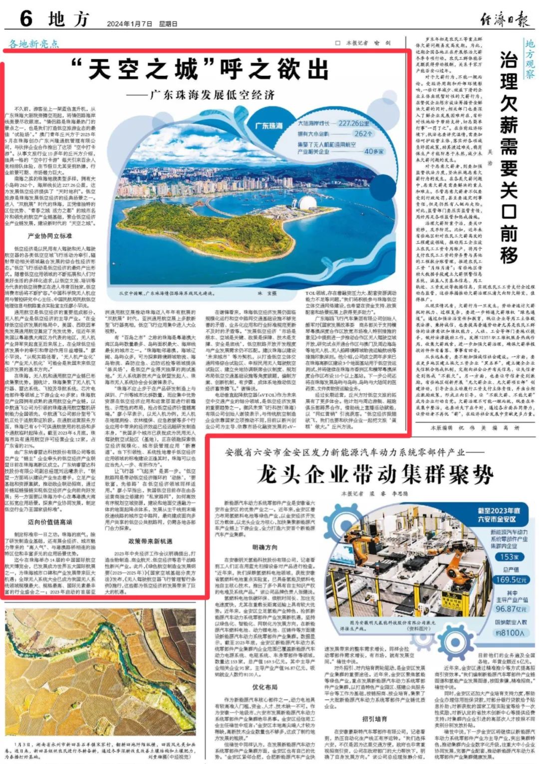 1月7月,经济日报刊发报道《“天空之城”呼之欲出——广东珠海发展低空经济》,无人系统在线将全文分享如下: