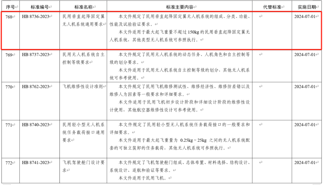 据工业和信息化部公告(2023年第38号),工信部于12月29日批准了1276项科技管理类行业标准,涉及航空行业、汽车行业、兵工民品、通信行业、化工行业等,其中航空行业标准由中国航空综合技术研究所组织出版,涵盖民用垂直起降固定翼无人机系统通用要求、航空质量管理体系要求、飞机结构完整性设计要求、无人机系统飞行手册编制规范、民用无人机系统数据链通用要求等76项。