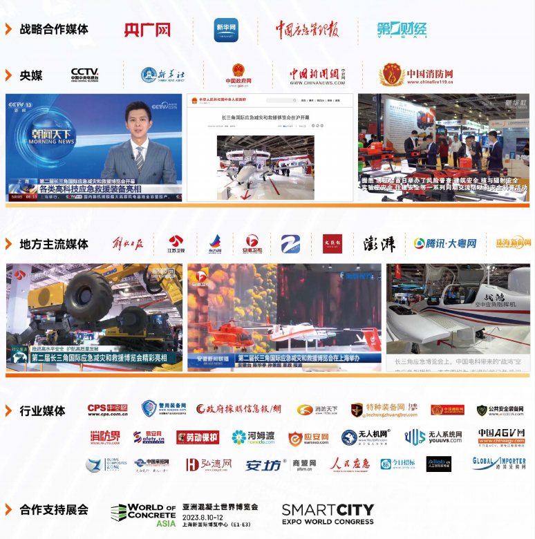 此外,博览会还将充分利用官方支持媒体(央广网、新华网、中国应急管理报、第一财经)和合作媒体(应急装备之家、中国消防网、消防界、劳动保护、中安网、警用装备网、政府采购信息报/网、消防天下、特种装备网、应安网、无人机网、复材新天地、公共安全装备网、中国采招网、人民应急、亿欧网、中国制造网等)、国际合作媒体(International Fire& Safety Journal、Health & Safety International、Fire Middle East等)等资源,为参展商和活动组织方开展亮点宣传,全方位提升各方参展单位的曝光度,进行超前预热。