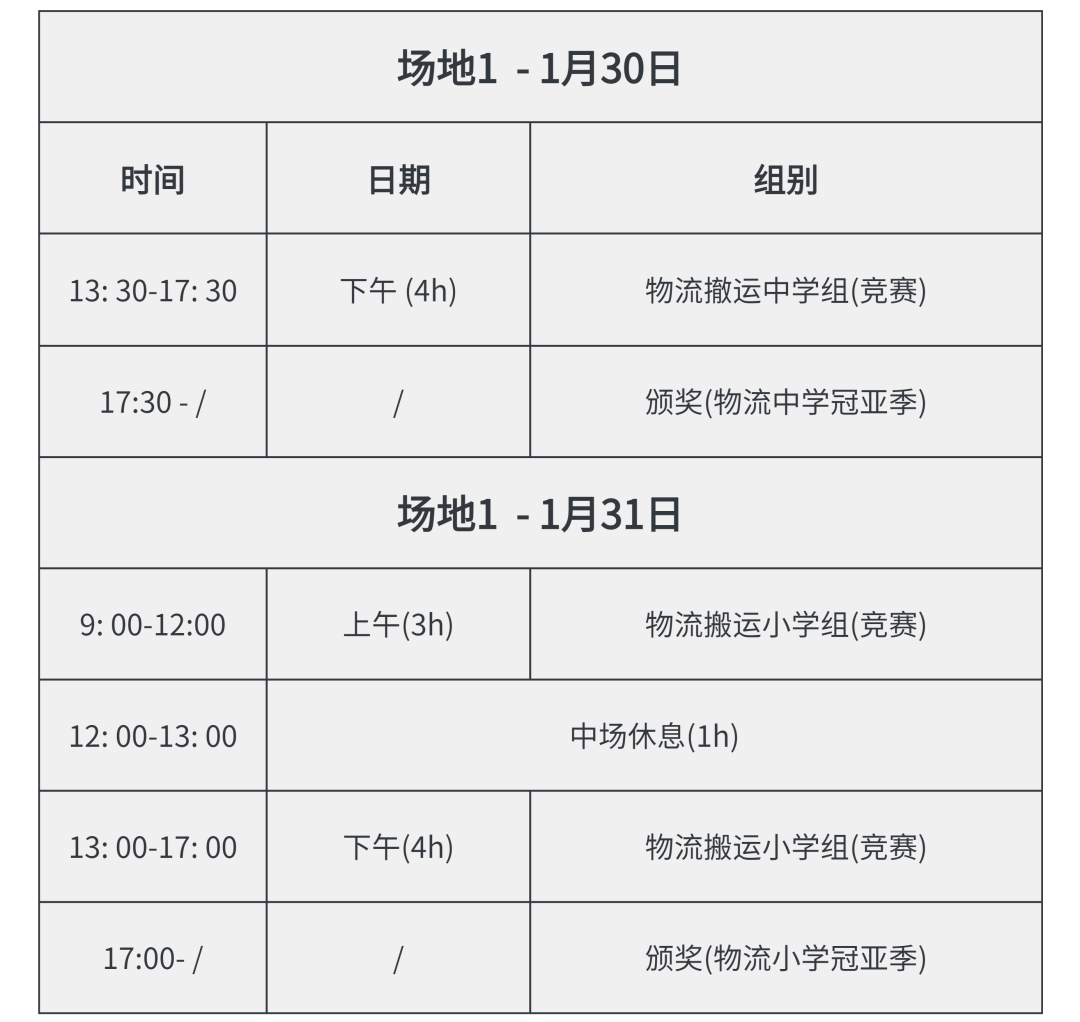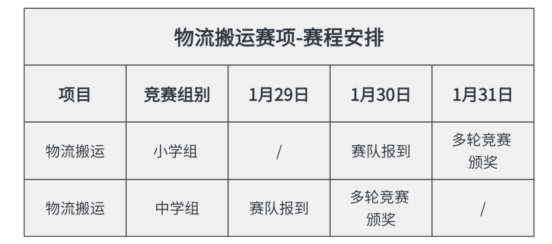 统一报到时间为1月28日,物流搬运赛的选手可以根据参与日期在1月29-30日进行报到。