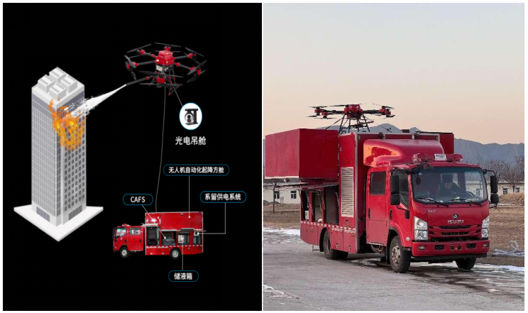 除了在通信、监视和侦察、联合多域作战等军工领域的应用,基于军用技术及成熟的工程化能力,「卓翼智能」实现在应急安全保障领域的产品降维打击。以高层灭火为例,高喷车灭火往往受到高度的限制,最高可喷射70米,但「卓翼智能」的车载无人机,可以带着水管快速升到高空,最高可达到150米。目前,已经上市的车载无人机最大负载量为75公斤,今年将推出120公斤级别负载量的产品。而最大载荷150公斤、有效作业高度为200米的车载无人机也已完成原理样机验证。