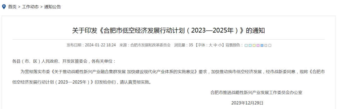 1月22日,安徽合肥市政府网站发布《合肥市低空经济发展行动计划(2023-2025年)》(以下简称《行动计划》)。《行动计划》聚焦“空间保障、产业集聚、场景示范、设施建设”四大领域,提出在2024年基本建成骆岗低空融合飞行试验片区,2025年基本建成具有国际影响力的“低空之城”,在科技研发、产业集聚、应用场景、标准规则、飞行保障等方面走在全球前列。