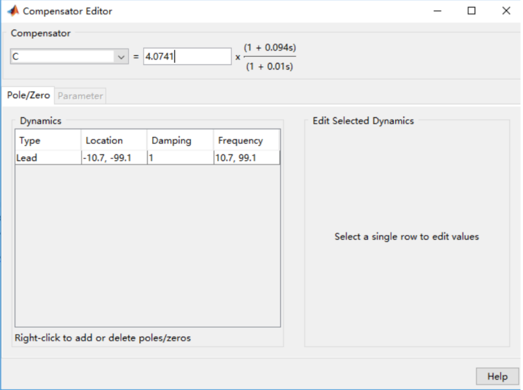 增加一个超前校正环节,提高相位裕度,还能进一步提高截止频率,增加响应速度。在 Bode 图中右键“add Pole/Zero”-“Lead”, 直接拖动零极点观测响应曲线,得到合适的矫正环节,如下图所示。