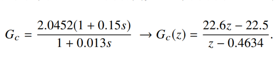 仿真实验:前述设计的校正环节是时域连续的环节,加入该模型应将其变为时域离散的环节。使用 c2d 函数将s域的传递函数(按下述提示自行输入)变为 z 域传递函数。