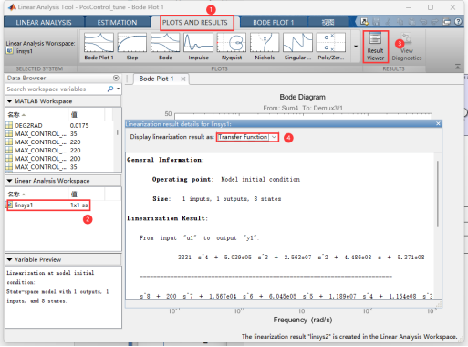 生成 Bode 图后,在左侧“Linear Analysis Workspace”中会出现“linsys1”变量。如下图所示操作,即可得到传递函数模型。