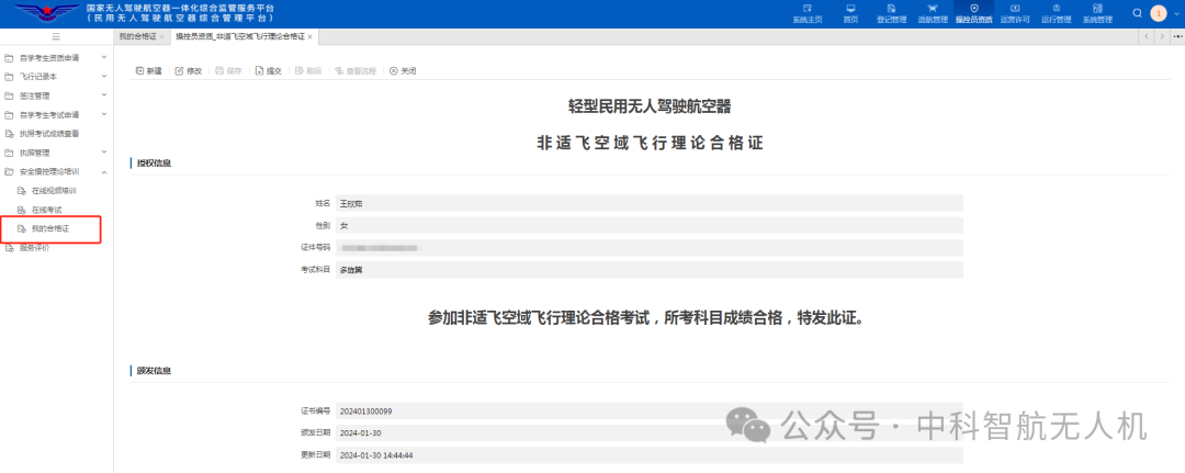 目前系统已开放安全操控理论培训、在线考试功能,考试通过后即可获得《轻型民用无人驾驶航空器安全操控理论培训合格证明》。具体可访问“操控员资质”-“安全操控理论培训”模块进行操作(仅限个人用户)。