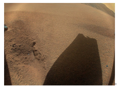2024 年 1 月 18 日完成第 72 次飞行后,美国宇航局的独创火星直升机拍摄了这张彩色图像,显示其一个旋翼桨叶的阴影,该旋翼桨叶在着陆期间受损。