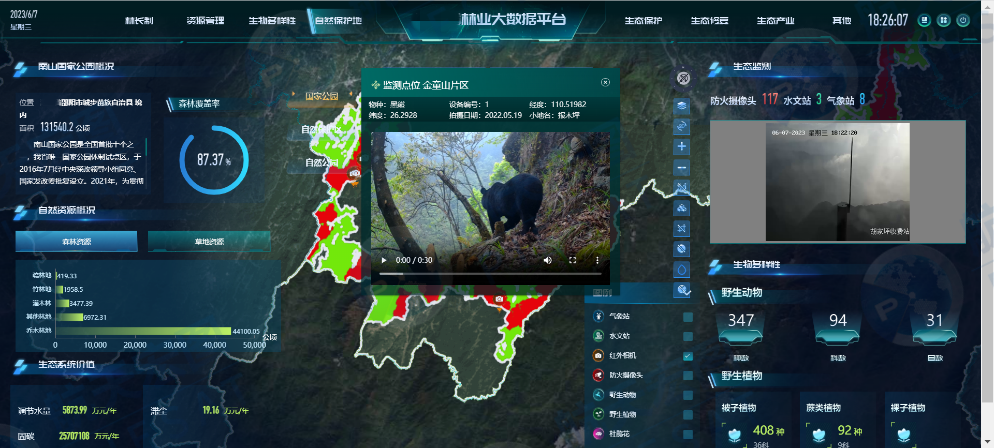 在保护地野生动物监测方面,平台应用遥感技术、图像识别、空间分析等技术实时监控、识别、分析野生动植物情况,实时掌握野生动物活动信息,为宏观决策提供直观的迁徙信息,分析环境生态数据,预测和评估生物多样性变化及生态趋势变化,加强生物多样性保护。