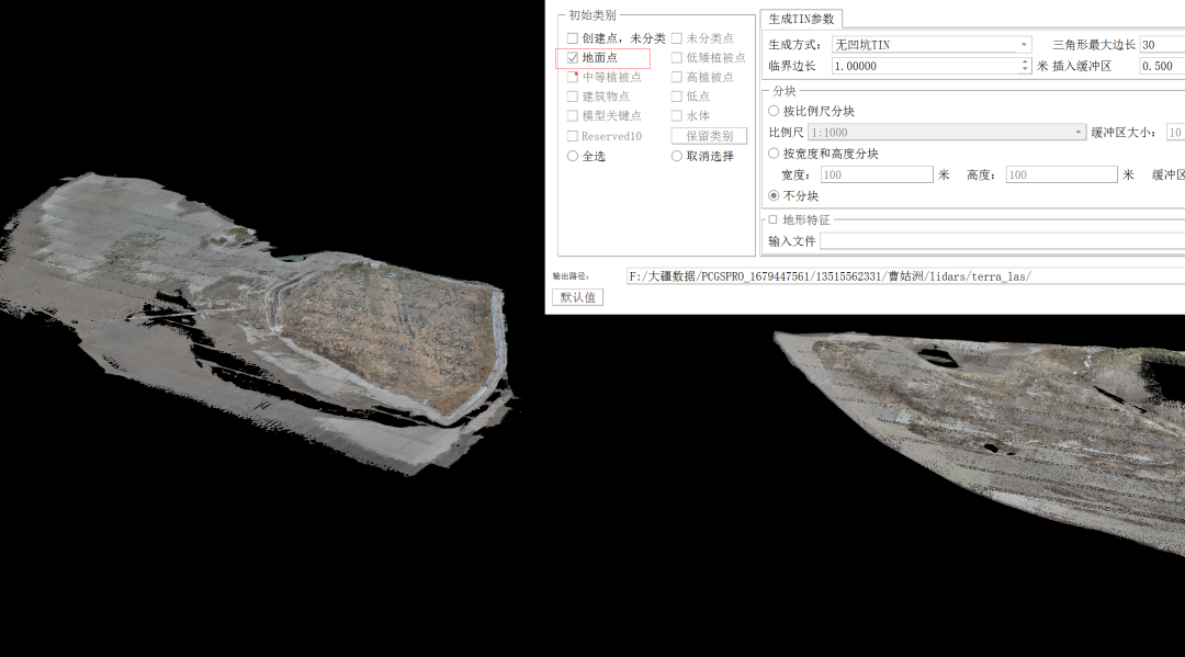 针对这种情况,该处技术人员在冬天树木凋零的情况下,利用机载雷达发射的激光脉冲对植被具有穿透的特点,搭配无人机设置较高重叠度,进行洲滩数据采集,从而生产高精度的三维点云图。通过点云模型处理软件对其进行重采样、去噪、点云平滑等操作生成“细模”,并分类植被、地面点、建筑物点云数据,按照《水运工程测量规范》生成大比例尺地形图对应的格网平高点数据,以此获取树木遮挡下的地面平高点,对比GNSS接收机采集的平高点数据后,更新电子航道图洲滩数据。