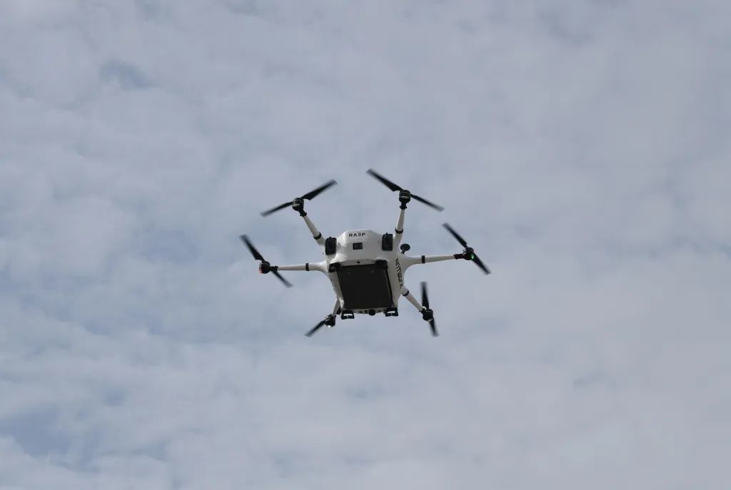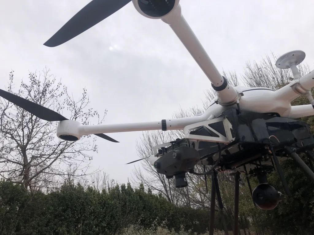 当天随行的负责人郭宗杰告诉半岛全媒体记者,无人机起飞重量25千克,展翼直径约1.2米,最大载重量为9千克。