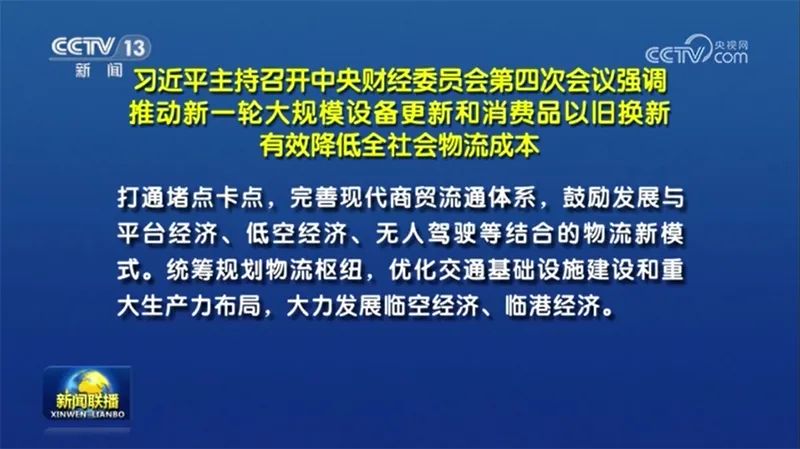中共中央总书记、国家主席、中央军委主席、中央财经委员会主任习近平2月23日下午主持召开中央财经委员会第四次会议,研究大规模设备更新和消费品以旧换新问题,研究有效降低全社会物流成本问题。习近平在会上发表重要讲话强调,加快产品更新换代是推动高质量发展的重要举措,要鼓励引导新一轮大规模设备更新和消费品以旧换新。物流是实体经济的“筋络”,联接生产和消费、内贸和外贸,必须有效降低全社会物流成本,增强产业核心竞争力,提高经济运行效率。