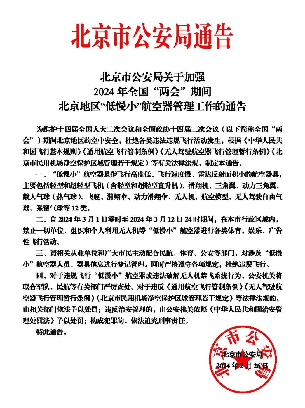 同时,为维护第十四届全国人民代表大会第二次会议和中国人民政治协商会议第十四届全国委员会第二次会议(以下简称全国“两会”)期间北京地区的空中安全,北京市公安局也发布了《北京市公安局关于加强2024年全国“两会”期间北京地区“低慢小”航空器管理工作的通告》。