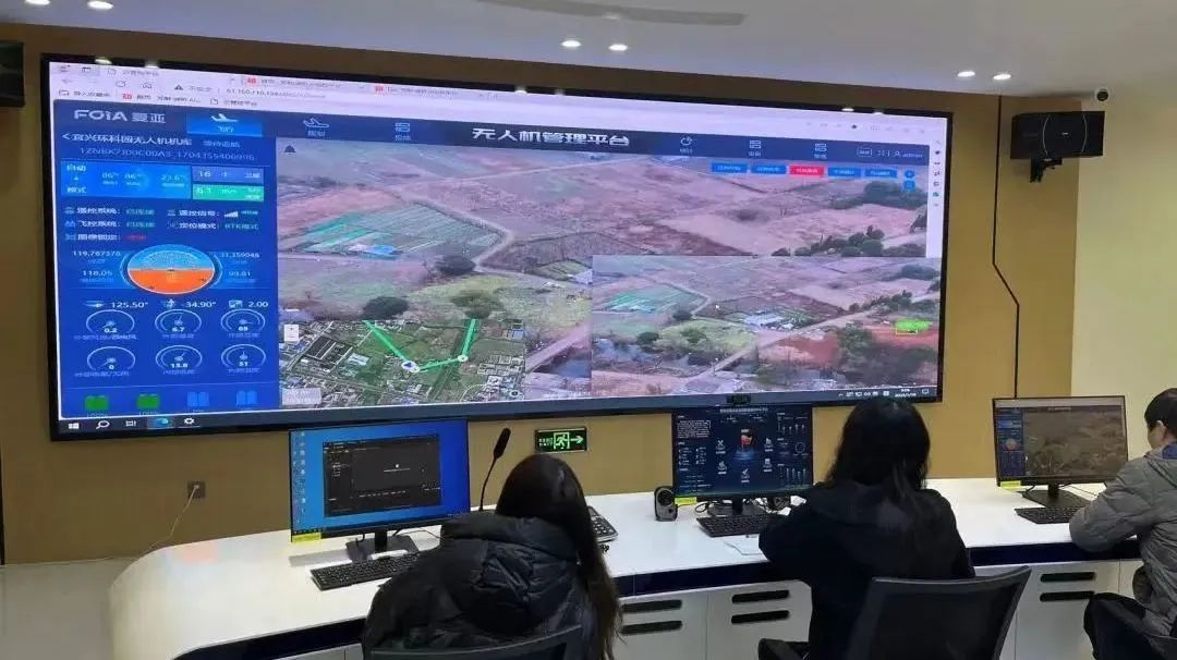 新街街道综治中心的大屏上正在展示无人机航拍传回的街景,画面实时传输至后台,经过智能分析比对,区域内的违章建筑、环境污染等城市管理“顽疾”无所遁形。