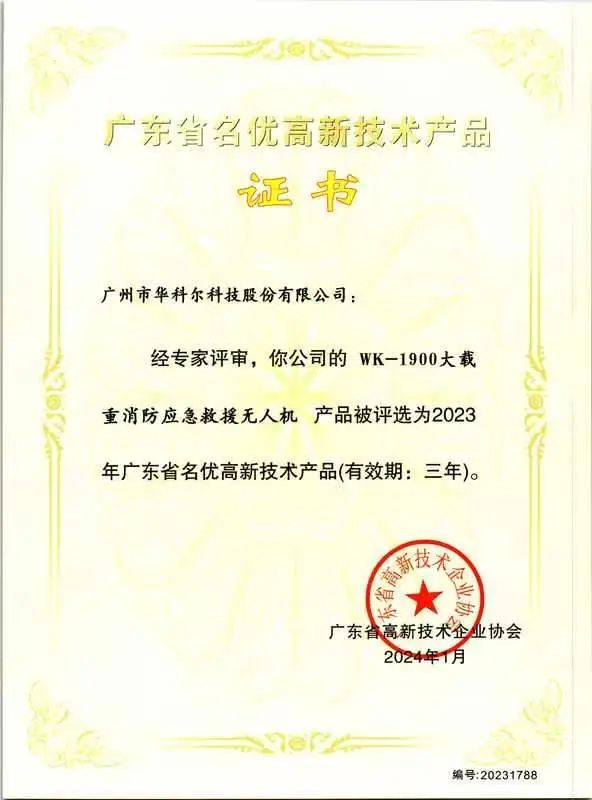近日,广州市华科尔科技股份有限公司旗下明星产品——WK-1900大载重消防应急救援无人机,凭借卓越的创新能力与前沿的研发技术,成功荣获“2023年广东省名优高新技术产品”称号。