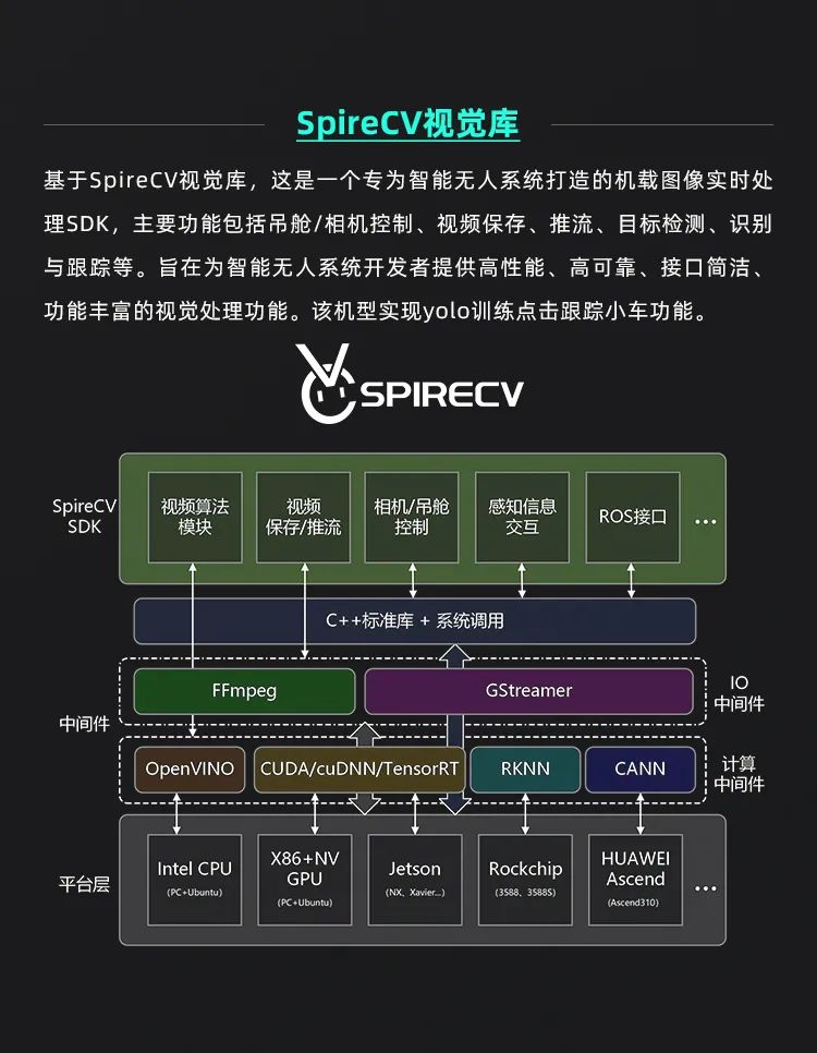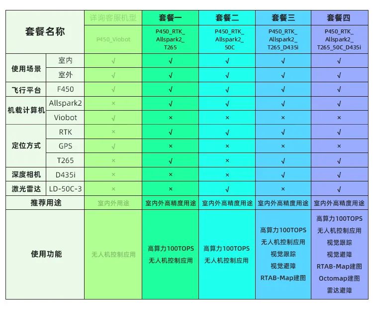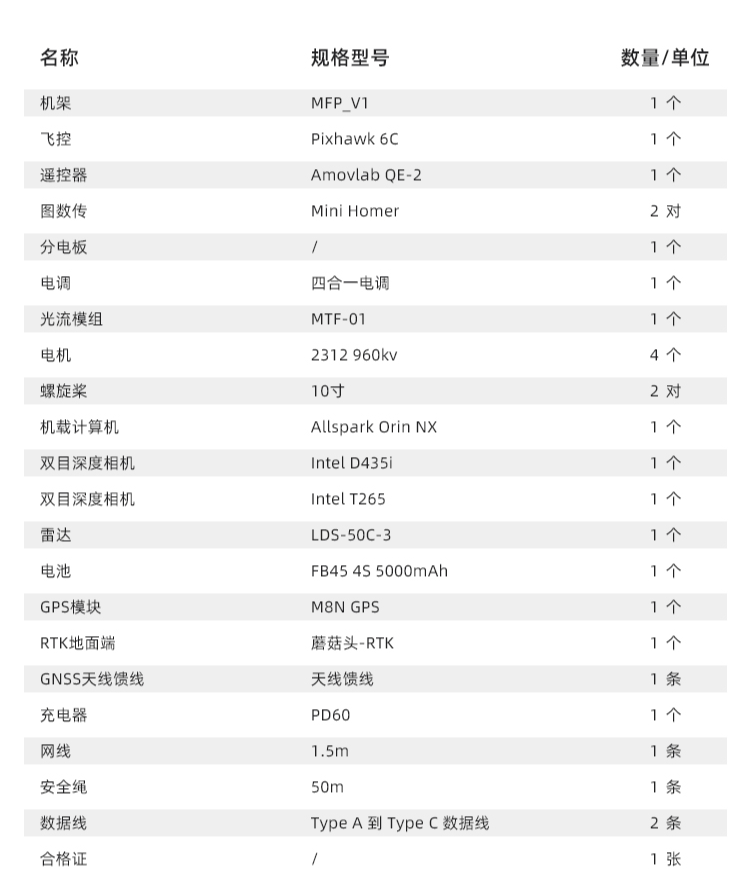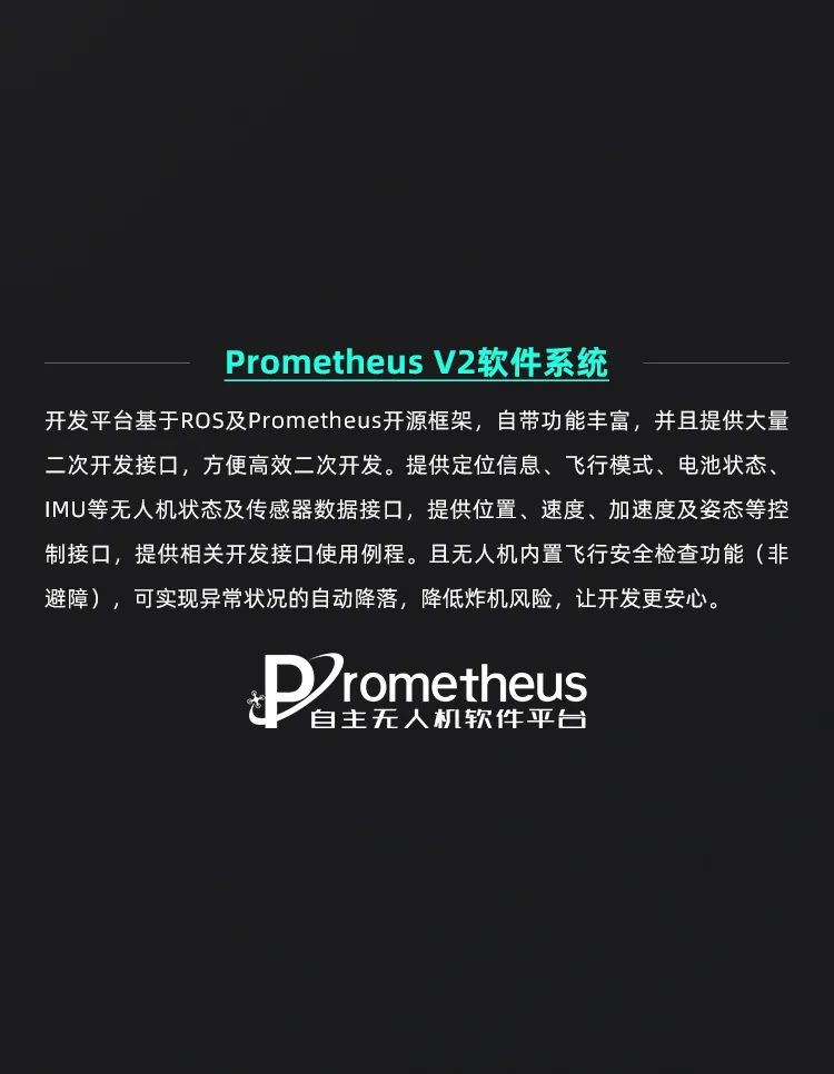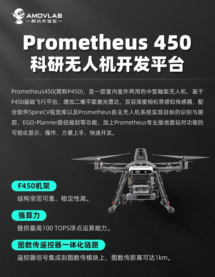 Prometheus 450(简称P450)是一款室内室外两用的中型轴距(410mm)无人机,基于F450基础飞行平台,搭载感知传感器二维平面激光雷达,双目深度相机等,配合软件Prometheus自主无人机系统和SpireCV视觉库,可实现目标的识别与跟踪,以及路径规划EGO-Planner等。
