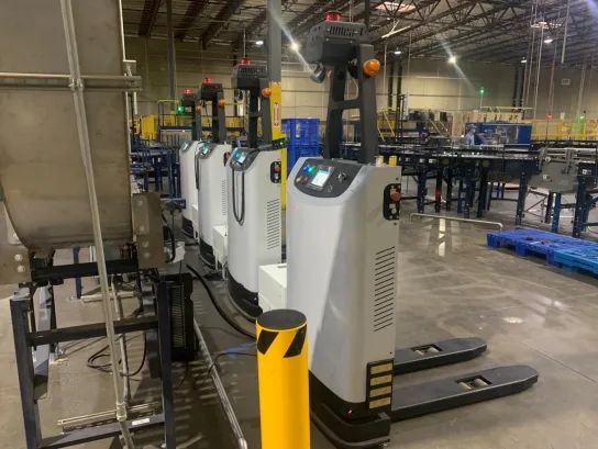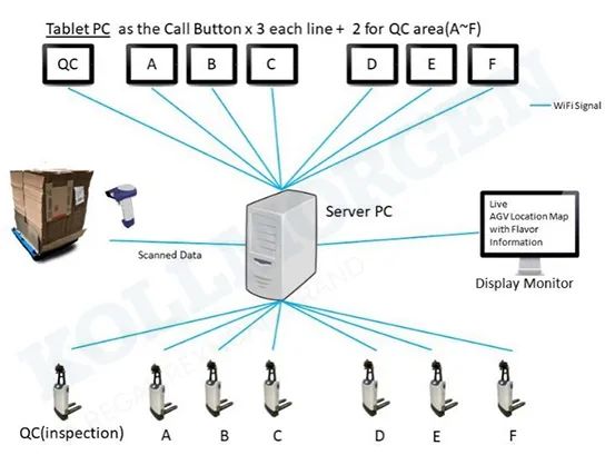 2023年,OKAGV为美国某食品企业提供了20台窄巷道AGV叉车的解决方案,助力客户实现12条产线到QC质检仓的自动化搬运。客户通过PDA呼叫,WMS系统指派AGV前往对应工位取货并运送至QC仓库,不仅大大提高了生产效率,也为工厂的连续运营提供了保障。