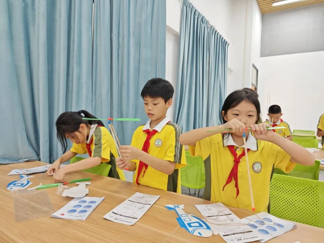孩子们领到了橡皮筋的奖品,在根据老师的提示,来做出符合直升机飞行动力学的原理。并仿照出直升机具体升空的方式及应用。