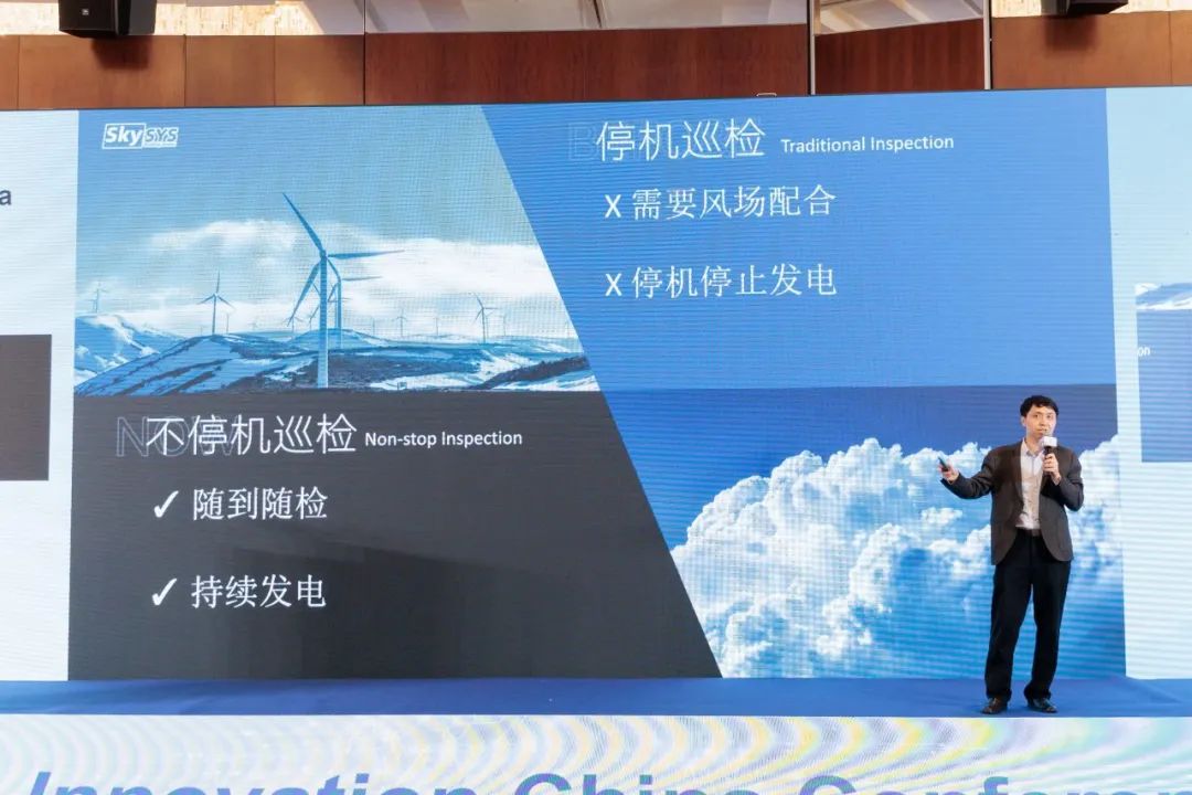 不停机状态下,无人机接受指令后自动起飞开始执行任务,实时回传所采集的数据,用户实时监控现场情况。会上,王海滨将高速旋转的风机叶片比作孙悟空挥舞的金箍棒,形象地刻画了无人机在风机不停机巡检中所面临的挑战。