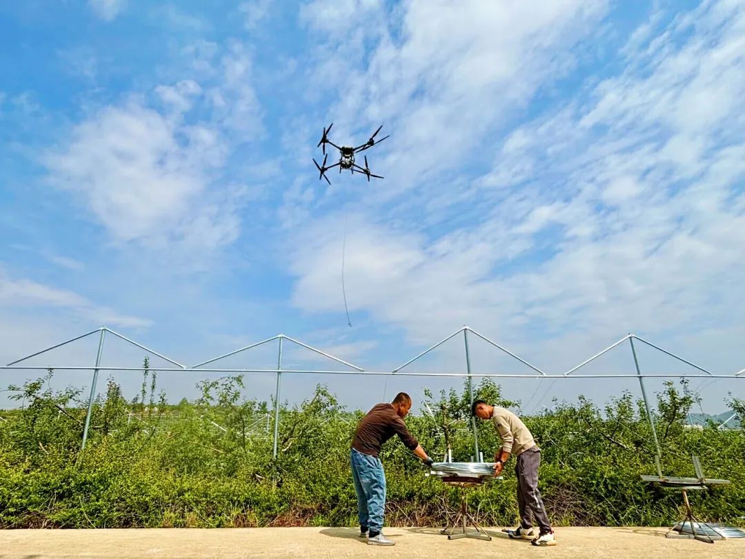 这台植保无人机来自陕西浩瀚防护公司,是该县首次引用无人机开展苹果园防雹网架线工作。据该公司负责人雷哲介绍,相比传统的人工架线作业,无人机可以进行大规模、快速的操作,每日架线面积可达50亩,生产效率相较提高20倍。“用无人机操作可以更好地节省时间、提高效率,为后面搭建防雹网打好基础,更好、更快、更准确地为苹果加固‘防线’。”雷哲说道。