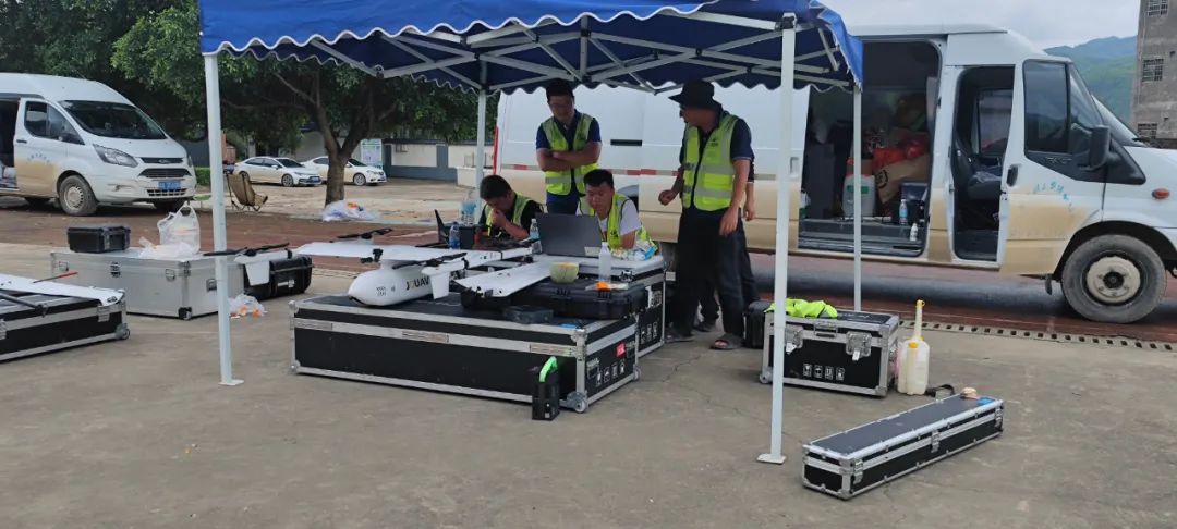 在现场指挥部的统一安排下,纵横股份应急救援小组携带纵横大鹏CW-15、CW-40两架无人机抵达武江区后,迅速与省应急厅航飞组、韶关市测绘院航飞组分析受灾位置和交通环境情况,明确现场测绘需求,并实地踏勘起飞场地,制定飞行计划。