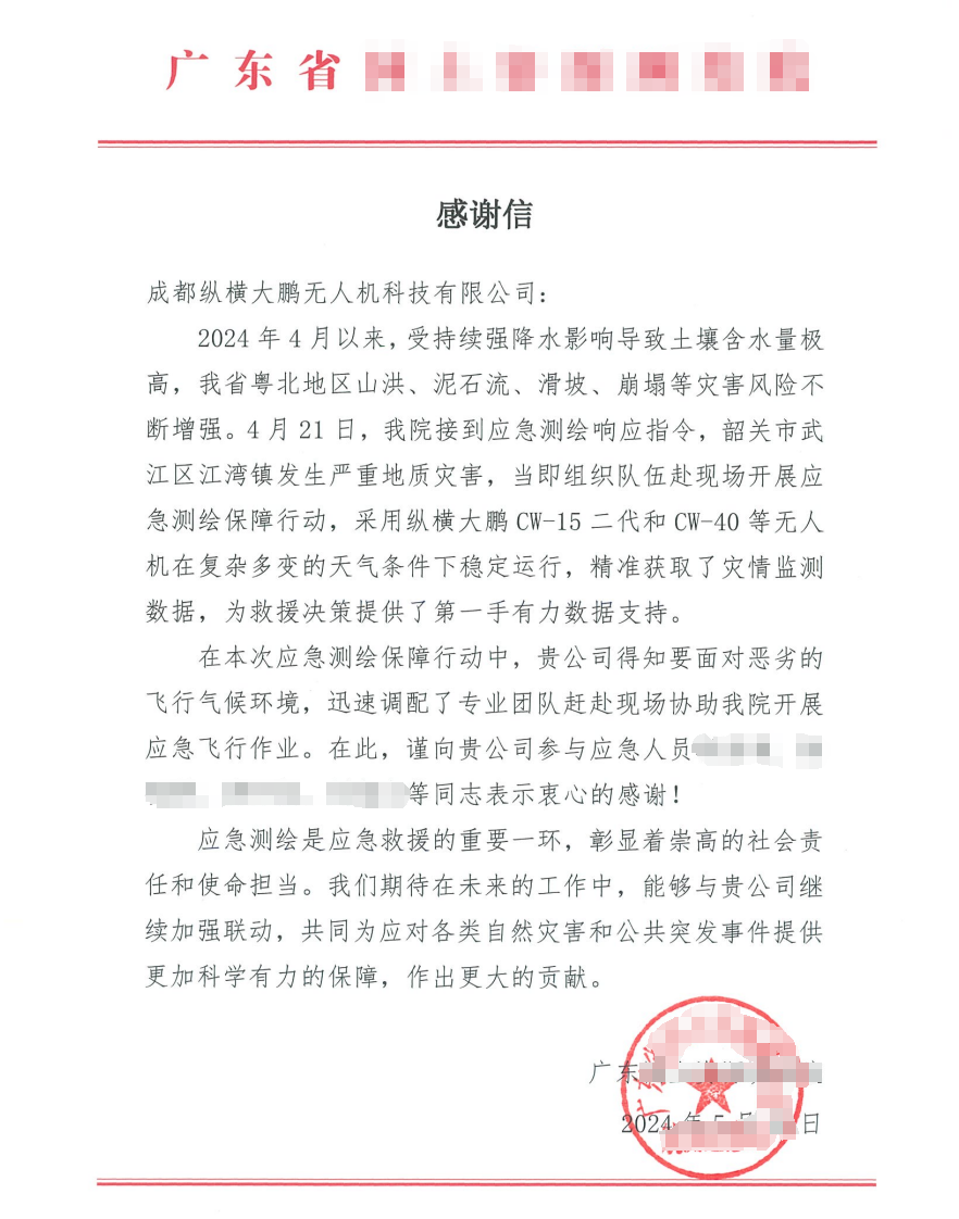 在此次应对韶关地区突发的洪水灾害过程中,纵横大鹏CW-15、CW-40无人机发挥了至关重要的作用,为应急工作提供了极大的支持和帮助,得到了相关单位的认可和赞扬。