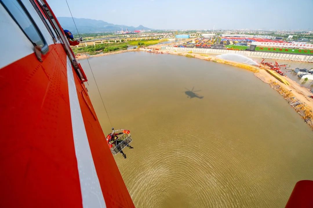 水上吊篮营救课目模拟一男子被洪水冲至河流下游,水流湍急,传统舟艇难以实施救援。根据指挥部命令,直8A直升机快速机动至落水人员水面上空悬停,利用绞车将救生员和吊篮索降入水,救生员将落水人员营救上机,快速转运救治,整个过程仅用1分50秒。