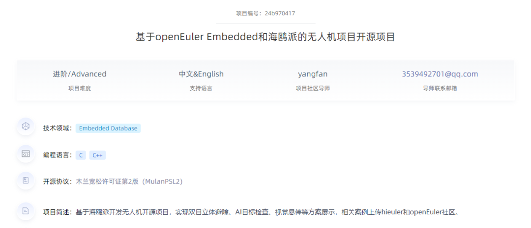 阿木实验室团队报名项目为基于openEuler Embedded和海鸥派的无人机项目开源项目。这是一个基于海鸥派开发无人机开源项目,实现双目立体避障、AI目标检查、视觉悬停等功能,目前正在火热招募学生中。
