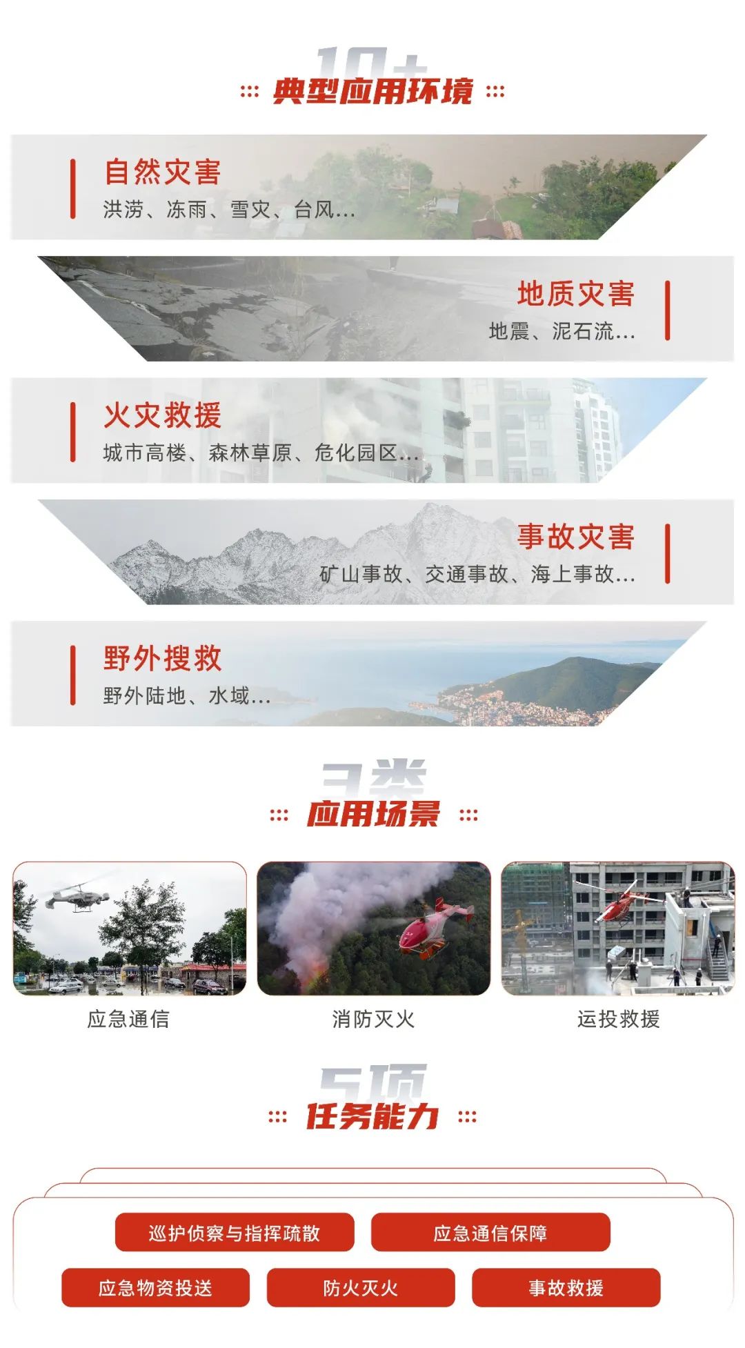 针对10+种典型应用环境,联合飞机围绕应急通信、消防灭火、运投救援三大应用场景,通过安全、易用、低成本的无人机飞行平台与地面测控装备、任务载荷的搭配使用、能力互补,打造六大无人机系统解决方案,形成以无人机救援平台为基础的应急通信保障、巡护侦察与指挥疏散、应急物资投送、消防灭火救援、事故人员搜救等五项能力,全面提升应急救援体系的无人化与智能化,服务保障能力的高效性与安全性。