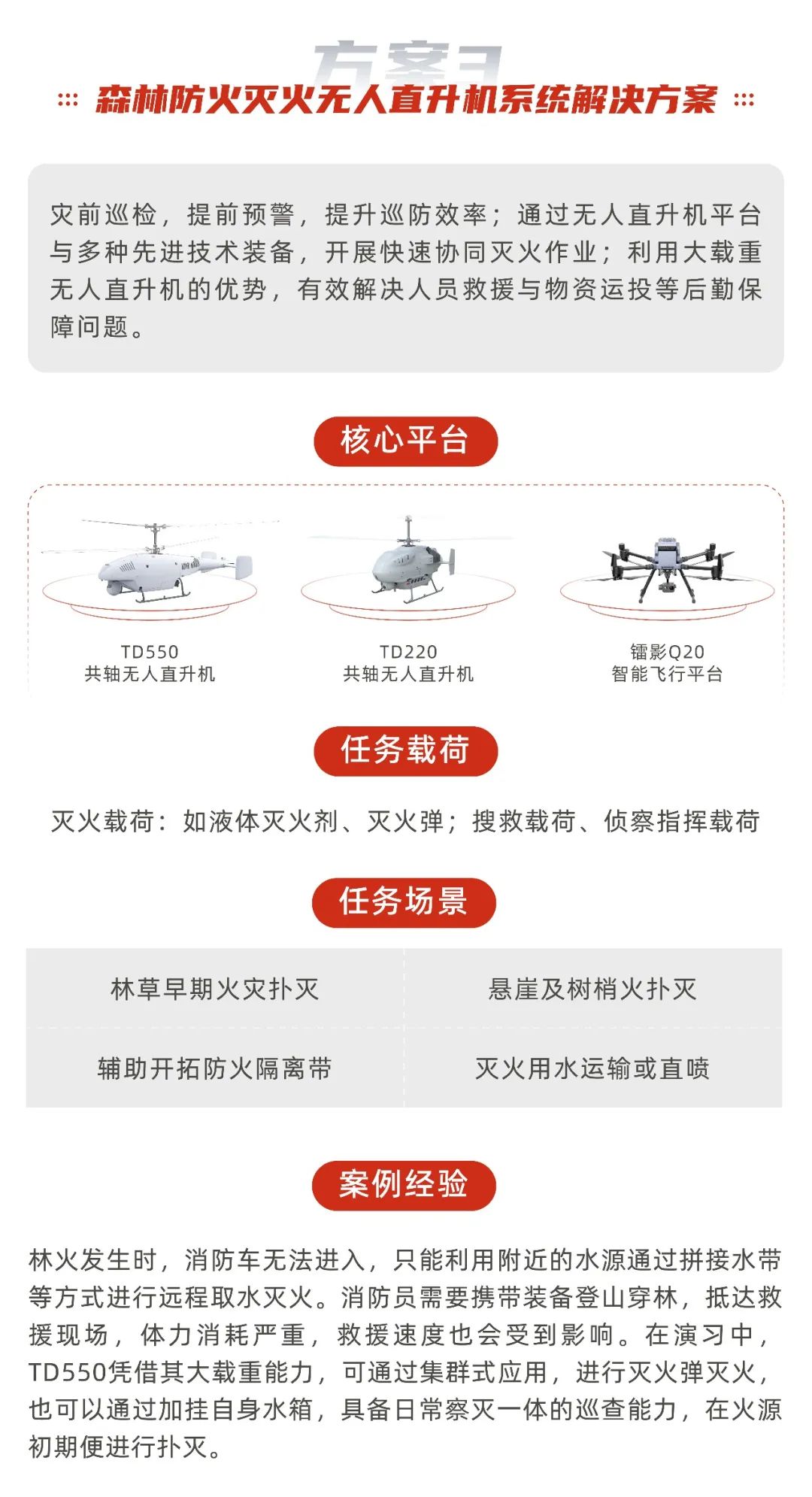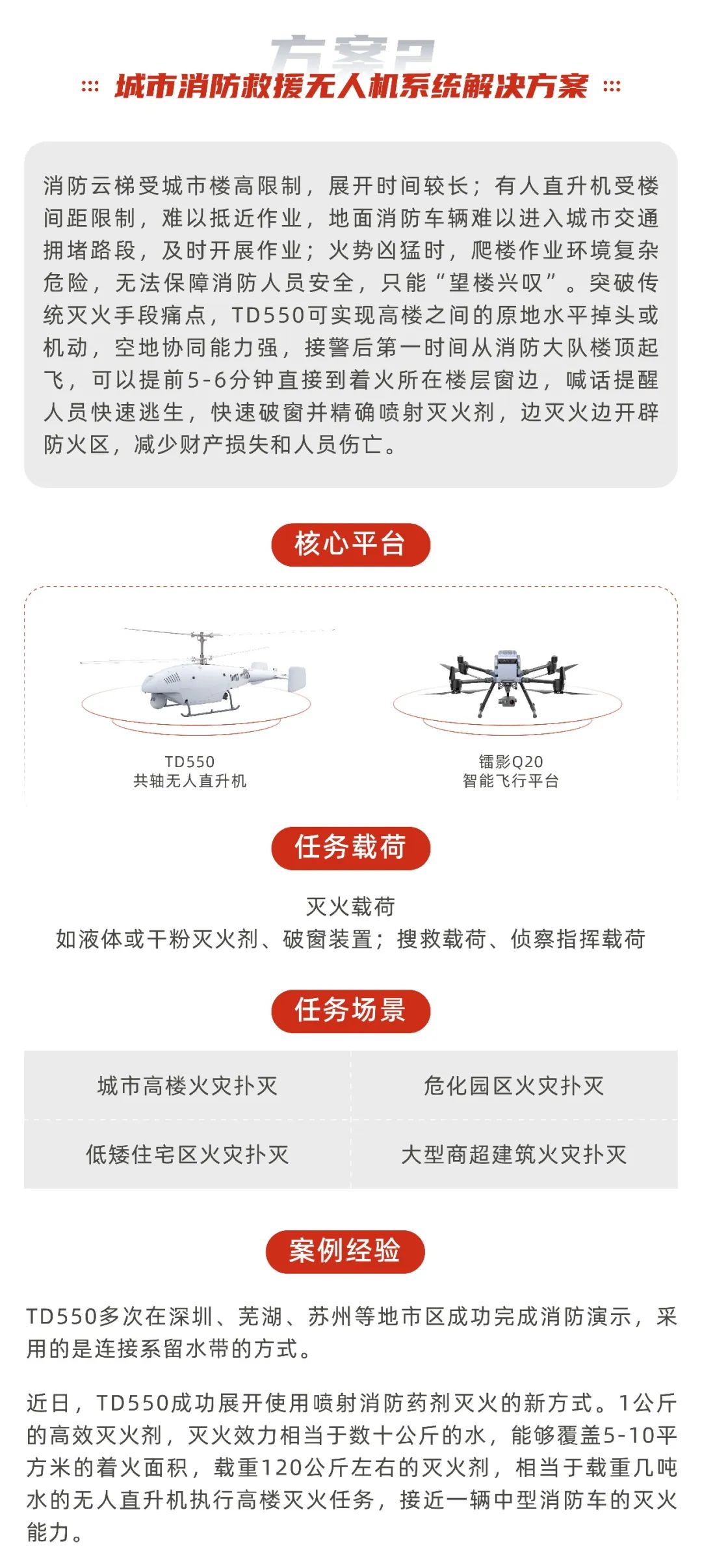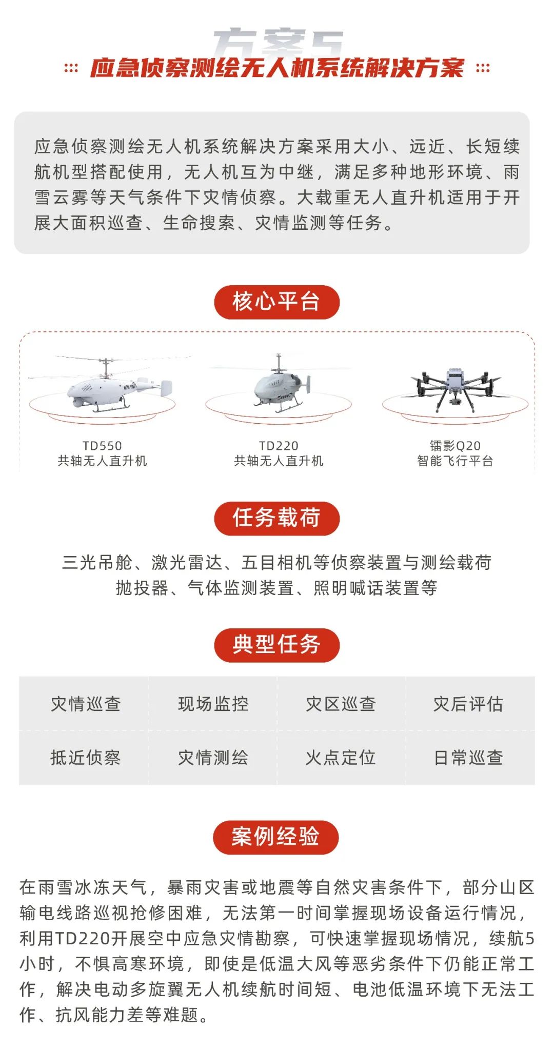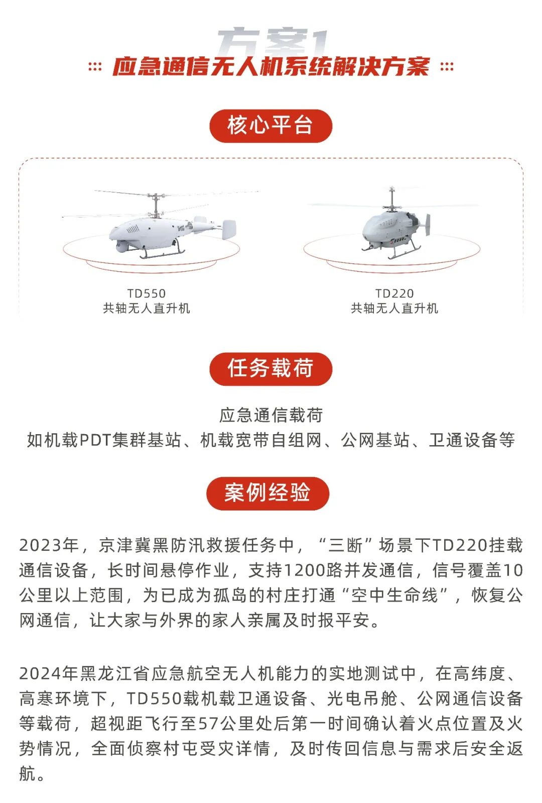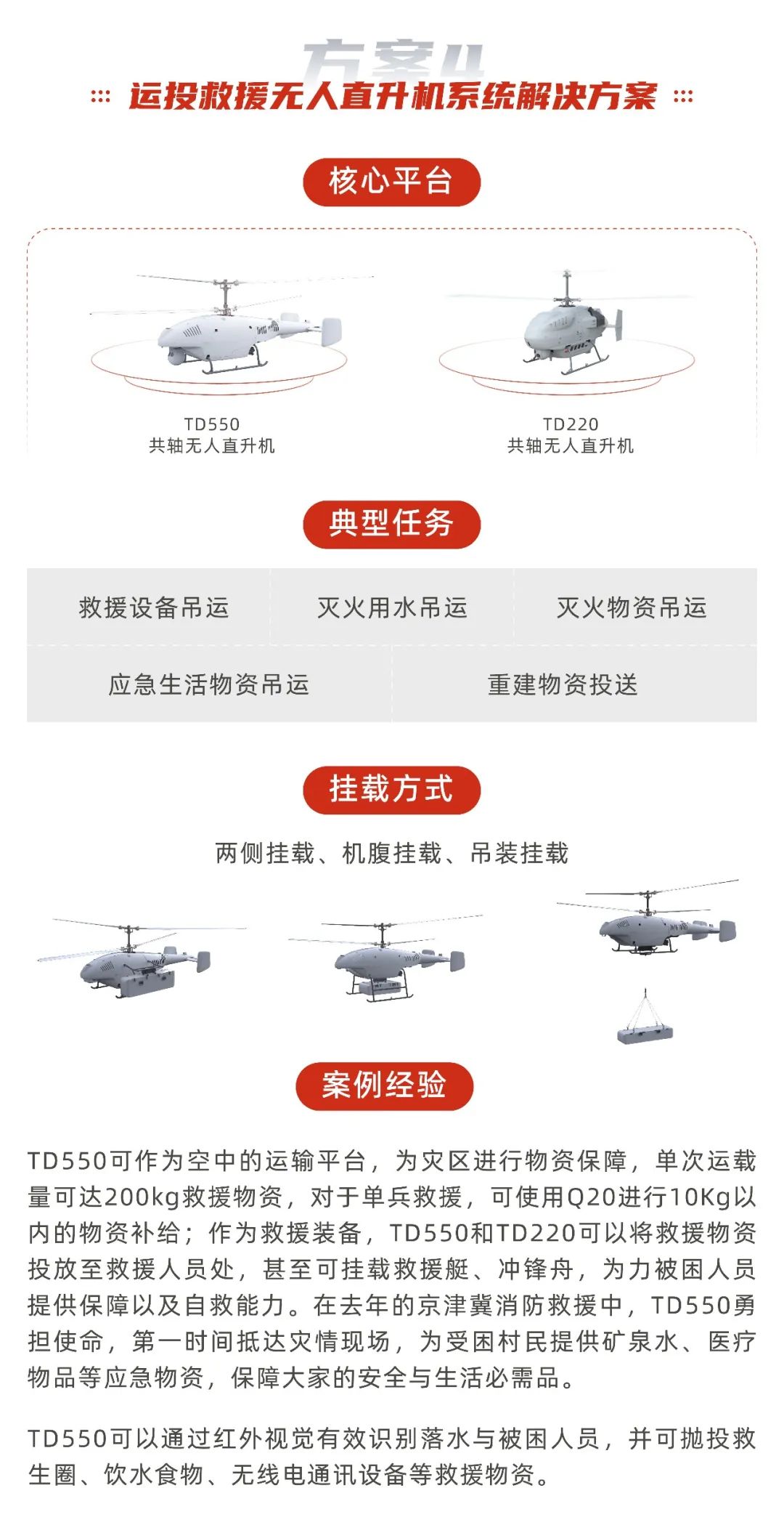自主研发的我国第一架电控共轴无人直升机TD220结构紧凑,机动灵活,展开撤收时间不超过20分钟,已累计10余年的飞行保障经验。TD550完成“大载重、长航时、高原性能”三重突破,最大载荷可达200kg,实用升限达6500km;采用双余度等多项飞行控制技术,控制精度更高,抗风强,更稳定;模块化设计,支持快速拆装、任务拓展能力强;高环境适应性能满足应急环境下多项任务及时出动执行的需求。TD550还获批特许飞行证,并成功召开首次适航合格审查会议,各项工作顺利推进中。