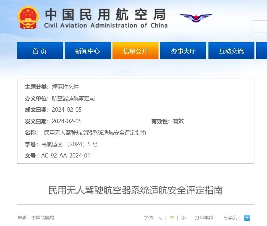 2023年5月31日,国务院、中央军委联合颁布了《无人驾驶航空器飞行管理暂行条例》,该条例第八条规定中型、大型民用无人驾驶航空器系统纳入适航管理。2024年2月5日,中国民用航空局颁发《民用无人驾驶航空器系统适航安全评定指南》,为无人机产品在安全规范、设计定型、试飞验证、安全功能测试和运行范围等方面提出了一系列安全评定要求。无人机产品通过以上安全评定要求,便可以通过获得民用无人驾驶航空器特殊适航证,获得适航批准。