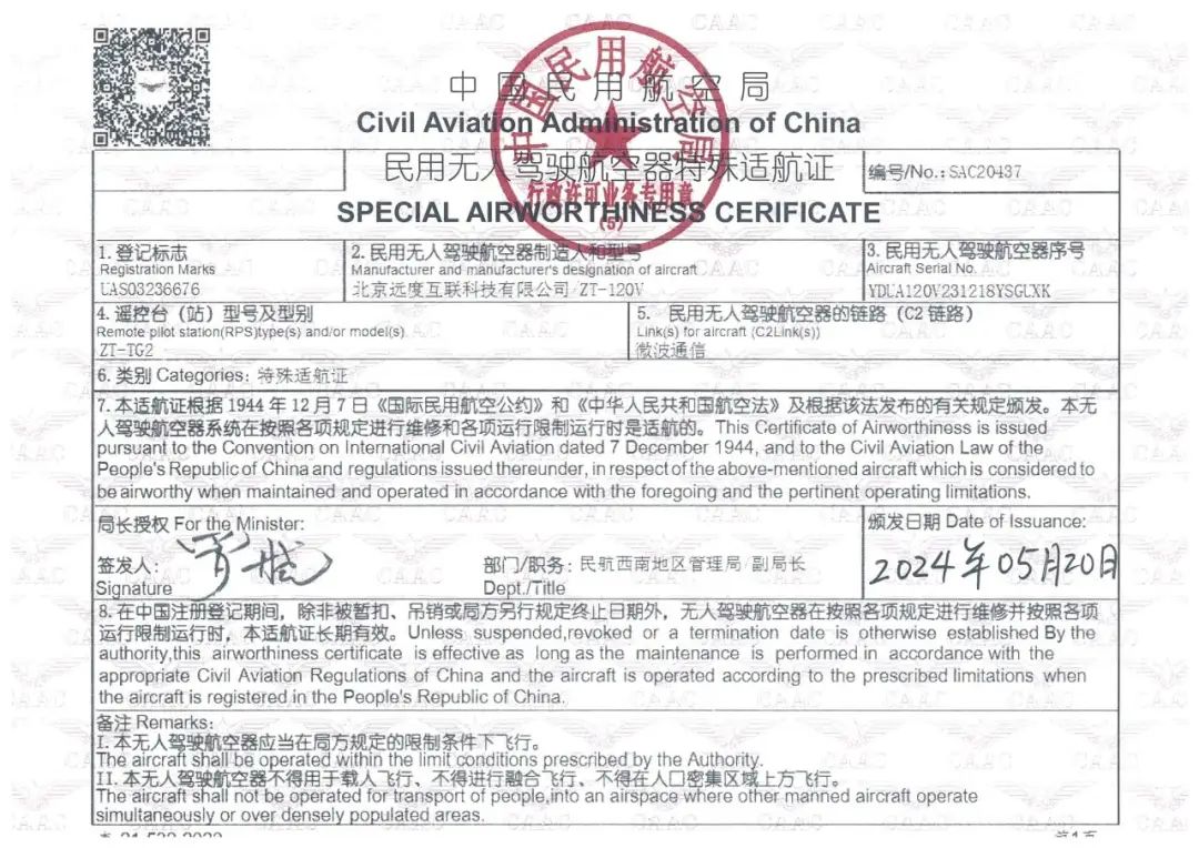 5月20日,远度科技ZT-120V无人机系统获得中国民用航空局颁发的民用无人驾驶航空器特殊适航证,成为首款获得特殊适航证的中型复合翼无人机。