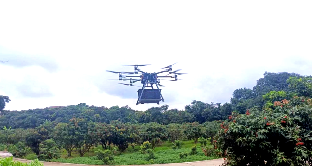 参与本次荔枝运输的是丰翼方舟150无人机,最大载重为50kg,续航20km,具有吊运、抛投、地面降落等多种交付方式,不受地形限制,运输方便,大大缩短果园到荔枝揽收点的时间。