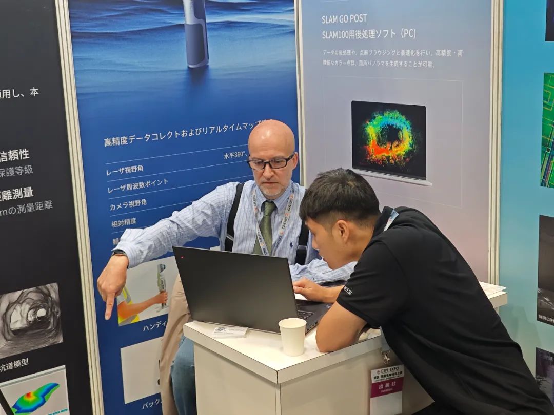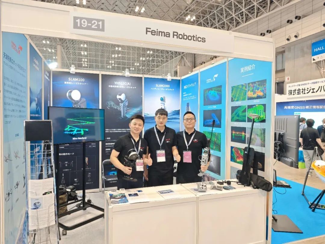 此次展会,飞马机器人带来全新研发的SLAM2000手持激光扫描仪及其配套产品,包括背包平台、全景相机、RTK模块等。SLAM2000配置高性能计算模块,可在数据采集过程中同步实时建图,并首次引入视觉相机,结合全新开发的SLAM算法,可大幅提升弱结构特征场景建图能力,极大丰富SLAM2000的适用场景。此外,飞马机器人重点向日本客户展现了使用灵活且具备手持、无人机、车载、背包等多平台挂载能力的3D移动测量设备SLAM100,并现场使用SLAM100采集了展馆点云数据,快速生产出展馆点云模型,获得参会人员的高度认可。