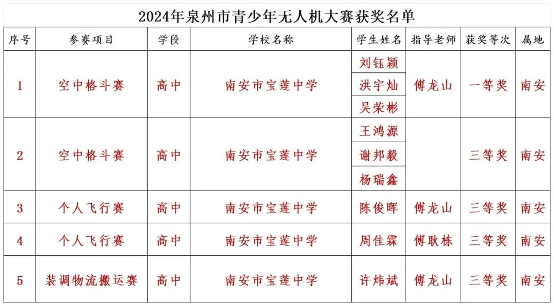 2024年泉州市青少年无人机大赛,我校在取得南安市赛优秀成绩的基础上,首次参加泉州市赛便取得佳绩。9支队伍经过两天的角逐,共有5支队伍9人次获奖。获奖名单如下: