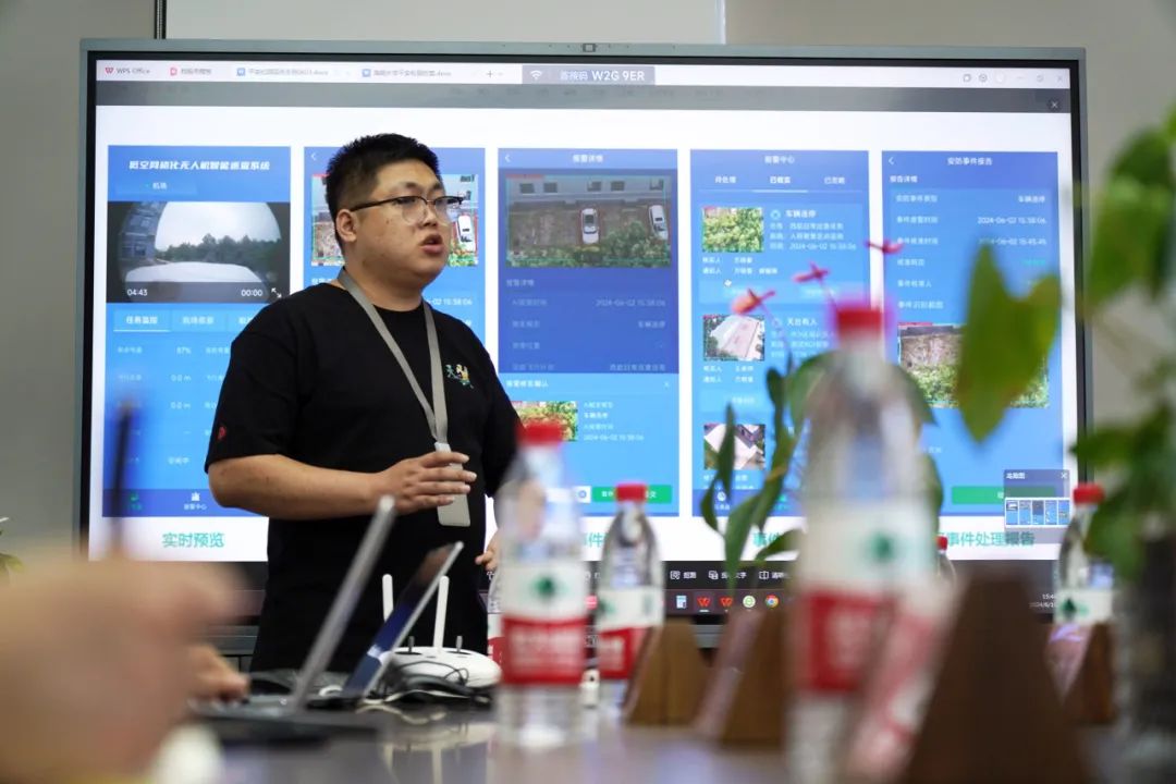 会议上平安校园业务技术经理万明斐对平安校园解决方案进行展示,该方案以机场作为硬件中枢终端,结合低空网格化无人机智能巡查系统,打造地空立体化安防校园技防体系,实现全天候7×24小时的自动巡查。该系统展示了无人机如何在校园不同区域进行网格化巡查,如何通过高清摄像头实时传输图像,以及如何通过智能分析预测和识别潜在危险。此外,该系统还可以根据不同的安全需求进行灵活的配置和调整,满足各种复杂场景下的安保需求。