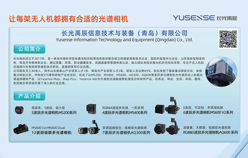 长光禹辰成立于2017年,是一家由中国科学院长春光机所和青岛高新区联合成立的高新技术企业,公司核心团队来自长春光机所空间光学部,在光谱遥感、光电探测领域具有深厚的理论基础和丰富的工程经验,掌握完整的光谱仪器系统设计、先进的嵌入式视觉开发、复杂场景定量遥感智能调光、高精度自动辐射校正、光谱数据半定量反演及应用等核心技术,形成了以MS200、MS400、MS600、AQ300、AQ600等系列多光谱相机为代表的无人机载光谱遥感硬件产品线,提供Yusense Fly、Wifi Web、DJI Pilot等多种相机参数设置及控制方式,依托Yusense Map/Map Plus光谱数据预处理及分析软件、Yusense Cloud端云一体化服务平台,在农业、林业、生态、环保、警用等领域开展了深入的行业应用。公司专注于无人机航空遥感与光电探测领域,持续推出革新的软硬件产品,落地更丰富的行业应用场景,致力于用技术和产品推动行业进步。