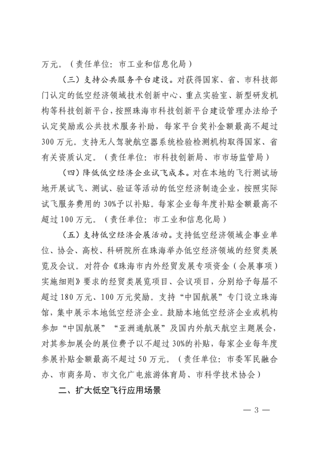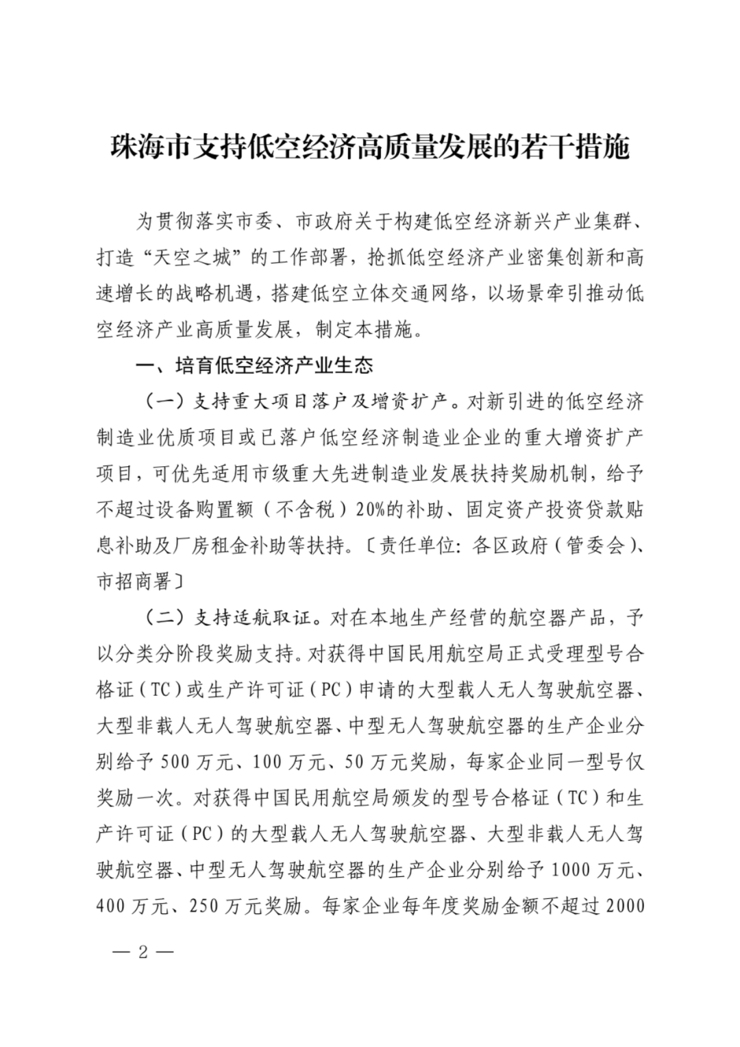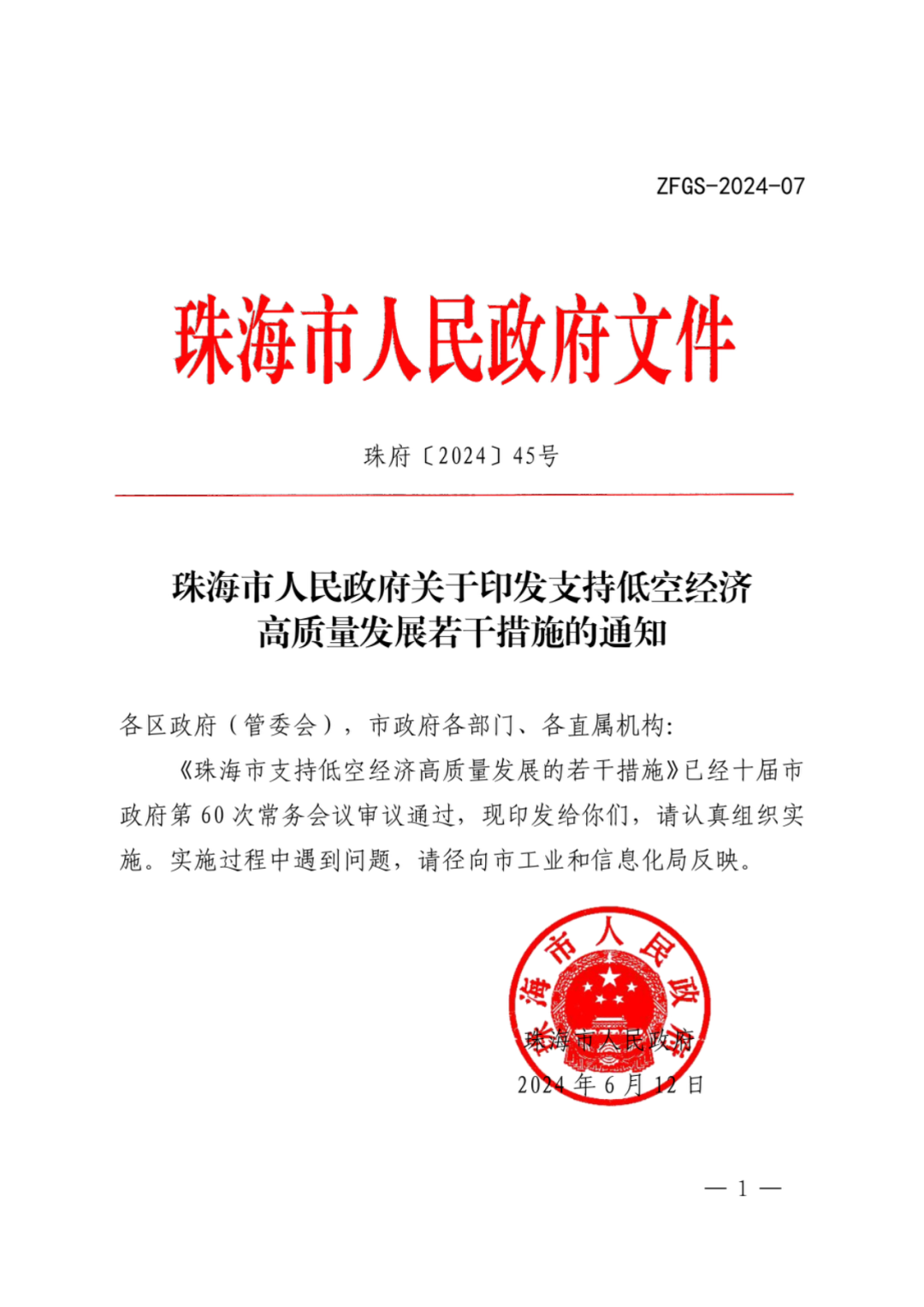 6月12日,珠海市政府正式印发《珠海市支持低空经济高质量发展的若干措施》(以下简称《若干措施》)。主要包括培育低空经济产业生态、扩大低空飞行应用场景、强化产业要素供给以及附则4个部分,核心政策条款共12条,旨在推动我市快速培育壮大低空经济新兴产业集群,加快打造“天空之城”。《若干措施》提出支持重大项目落户及增资扩产、支持适航取证、支持公共服务平台建设、降低低空经济企业试飞成本、支持低空经济会展活动等五项具体措施。该措施自2024年6月12日印发起实施,有效期至 2026 年 12 月 31 日。