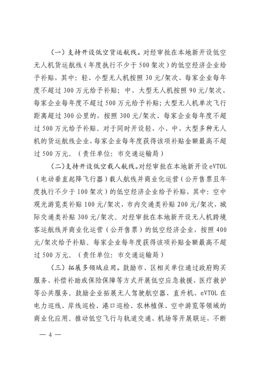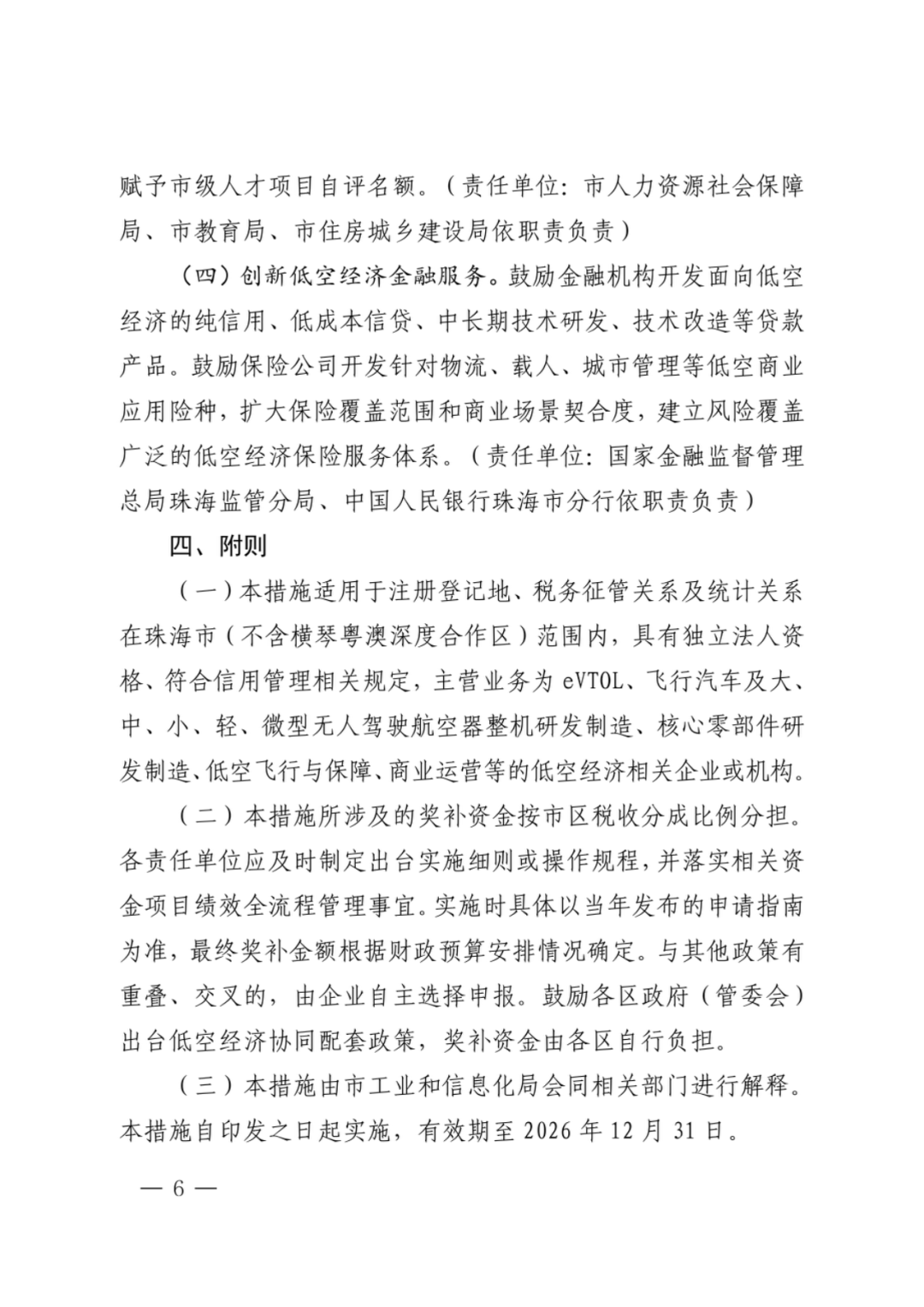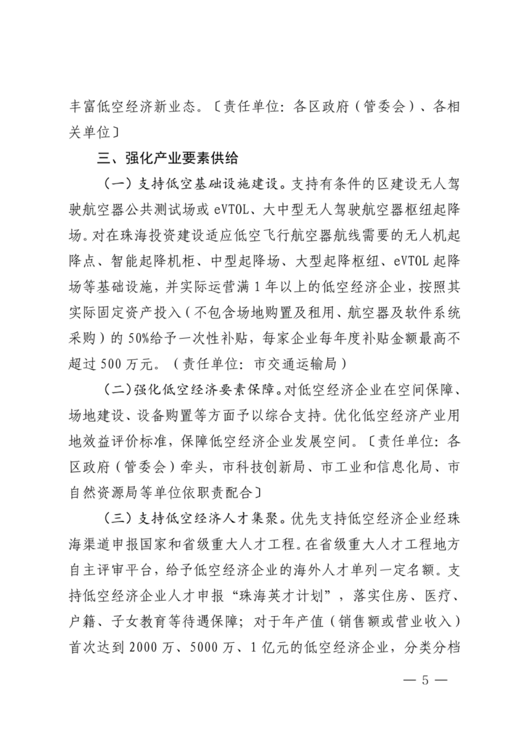 6月12日,珠海市政府正式印发《珠海市支持低空经济高质量发展的若干措施》(以下简称《若干措施》)。主要包括培育低空经济产业生态、扩大低空飞行应用场景、强化产业要素供给以及附则4个部分,核心政策条款共12条,旨在推动我市快速培育壮大低空经济新兴产业集群,加快打造“天空之城”。《若干措施》提出支持重大项目落户及增资扩产、支持适航取证、支持公共服务平台建设、降低低空经济企业试飞成本、支持低空经济会展活动等五项具体措施。该措施自2024年6月12日印发起实施,有效期至 2026 年 12 月 31 日。