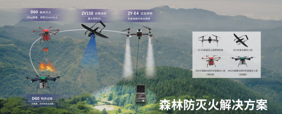 采用长续航复合翼无人机ZV-15E,依托智能视频巡检及结构化数据分析,快速发现火点、定位火点、提高火情巡检能效,降低人工成本;同时,采用无人机辅助灭火技术、无人机空中组网技术,无人机实时态势感知技术,为火场与指挥中心搭建一条全面可视化通道,多技术手段协同作战。事前预防,事中打早灭小,事后完整复盘。