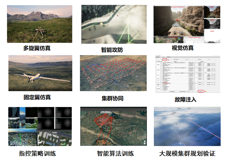 通过私有云或公有云部署,实现千架级规模的无人系统智能算法训练,为大规模无人集群低空任务规划、冲突消解、人工智能模型训练等前沿研究领域提供高可信度的仿真环境,实现无人系统集群智能化与实战化应用的快速推进。